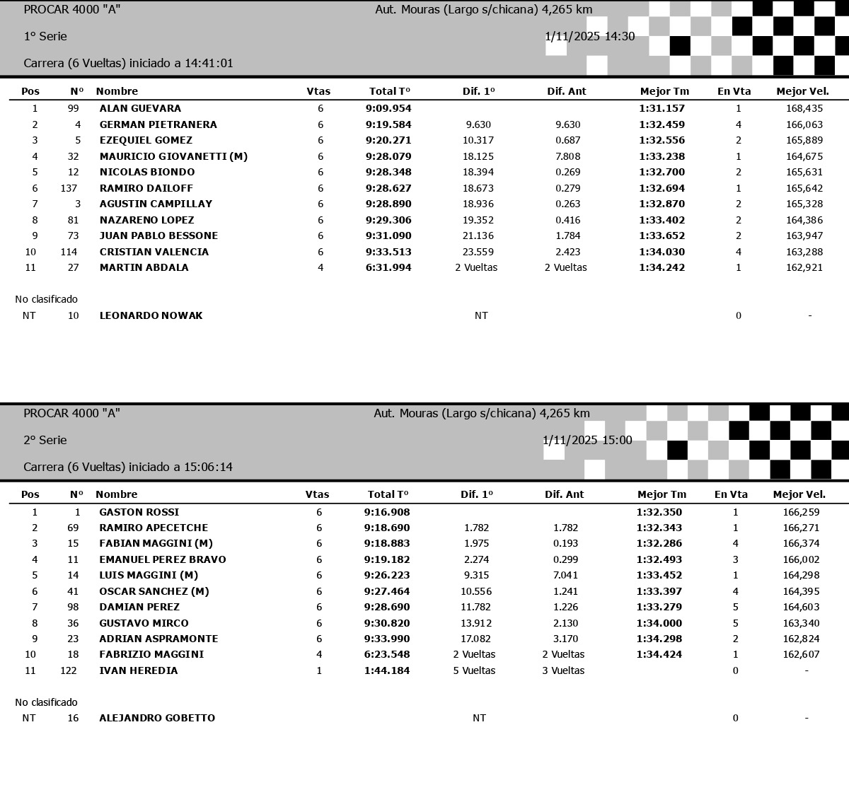 Mediando la tarde se pusieron en marcha las dos series selectivas de la clase mayor del Procar. La Primera serie tuvo como protagonista a Alan Guevara que rápidamente tomo la punta de la competencia y establecido una abrumadora diferencia con el resto. Biondo en los primeros metros se defendió de Ezequiel Gómez, con un Pietranera desde el cuarto puesto expectante, destacando que lamentablemente Nowak debía abandonar por problemas mecánicos. Guevara acrecentaba más las diferencias, Biondo perdía terreno en la fila india y Pietranera doblegaba a Gómez para posicionarse como escolta. Lamentablemente Abdala debía abandonar también por problemas en su Dodge. La bandera a cuadros caía sobre el Plateado Ford de Guevara dejando segundo a Pietranera por mas de nueve segundos mientras que Gómez accedía al tercer puesto.