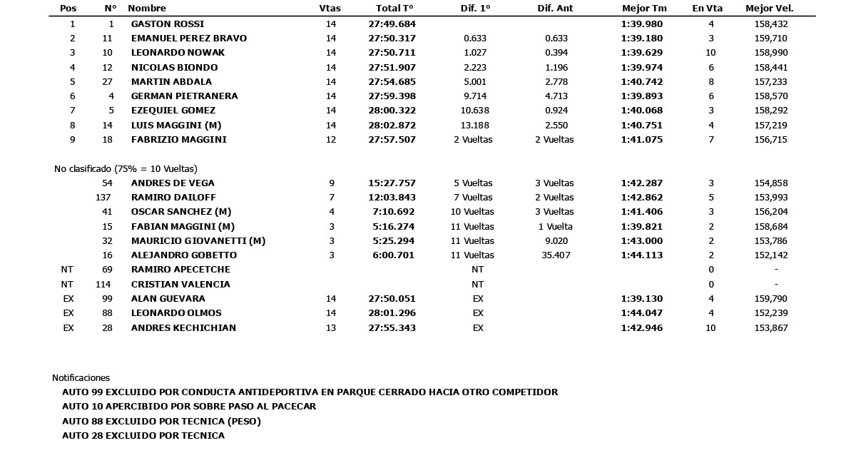 Perez Bravo que remontaba terreno se acercaba a Guevara y este hacia lo mismo sobre Rossi teniendo a los tres primeros contendientes al torneo ocupando las tres primeras posiciones. Un gran golpe de escena se generó promediando la competencia donde un inconveniente en la caja de velocidades de Perez Bravo lo privó de avanzar generándose su atraso. Pudo haber sido de posiciones pero un Pace Car faltando pocas vueltas por el abandono de Andrés de Vega hizo que la carrera terminara bajo condiciones de neutralización. Esto generó que Rossi pudiera arribar tranquilamente a la bandera a cuadros obteniendo su segunda corona en la divisional. Posteriormente a la finalización, los Comisarios Deportivos decidieron excluir a Guevara por lo cual Pérez Bravo quedo segundo y el podio fue completado por Leo Nowak. Cuarto arribó Nicolás Biondo, quinto Martín Abdala, sexto Germán Pietranera, séptimo Ezequiel Gómez, octavo Luis Maggini y noveno Fabrizio Maggini.