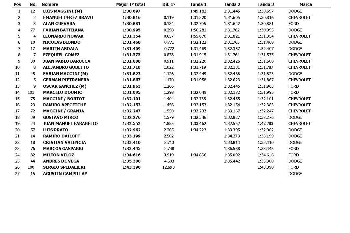 Cerrando la jornada 16.20hs con un total de 27 autos que giraron, Luis Maggini Padre marcaba 1min 30seg 697/1000 para ser el más rápido del viernes, dejando segundo a Tiki Pérez Bravo por 119 milésimas y tercero a Guevara y su Ford por 184 milésimas, destacando que en este ensayo solo 8 autos quedaron encerrados dentro del primer segundo de diferencia.