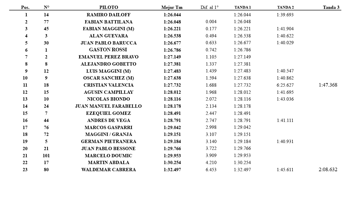 En el último ensayo 23 unidades salían a pista en una condición de pista optima y nuevamente Ramiro Dailoff, sobre el Dodge del equipo Valencia Racing era el más veloz registrando 1min26seg 044/1000 para ser el más rápido de la jornada, dejando segundo a Fabian Battilana por tan solo 4 milésimas y tercero a Fabian Maggini por 177 milésimas.