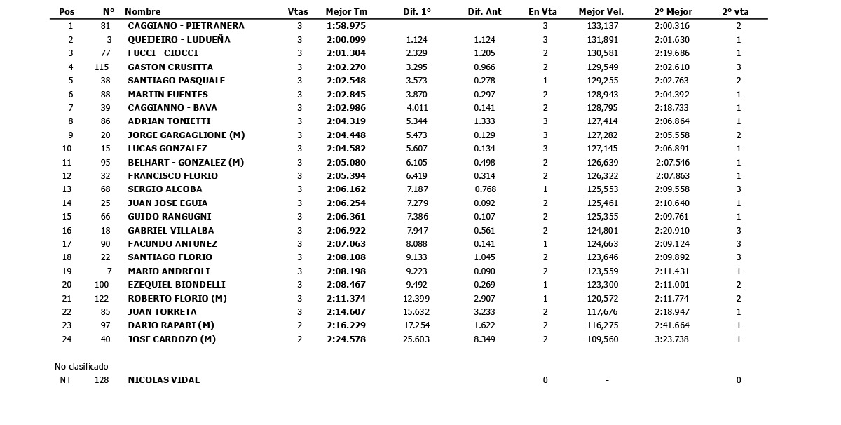 Segundo quedó el binomio Queijeiro – Ludueña, que en este caso al volante se encontraba Nereo, estableciendo un registro de 2 min 009 seg 099/1000 a 1 seg 124/1000 del poleman y tercero quedó el binomio Ciocci – Fucci que al volatne se encontraba Diego, a 2 seg 329/1000. Cuarto quedó Gastón Crusitta a 3 seg 295/1000 y quinto Santiago Pasquale a 3 seg 573/1000. Resulta importante recalcar que el Pasquale terminó siendo el mejor del segundo grupo ya con una condición de pista más delicada.
