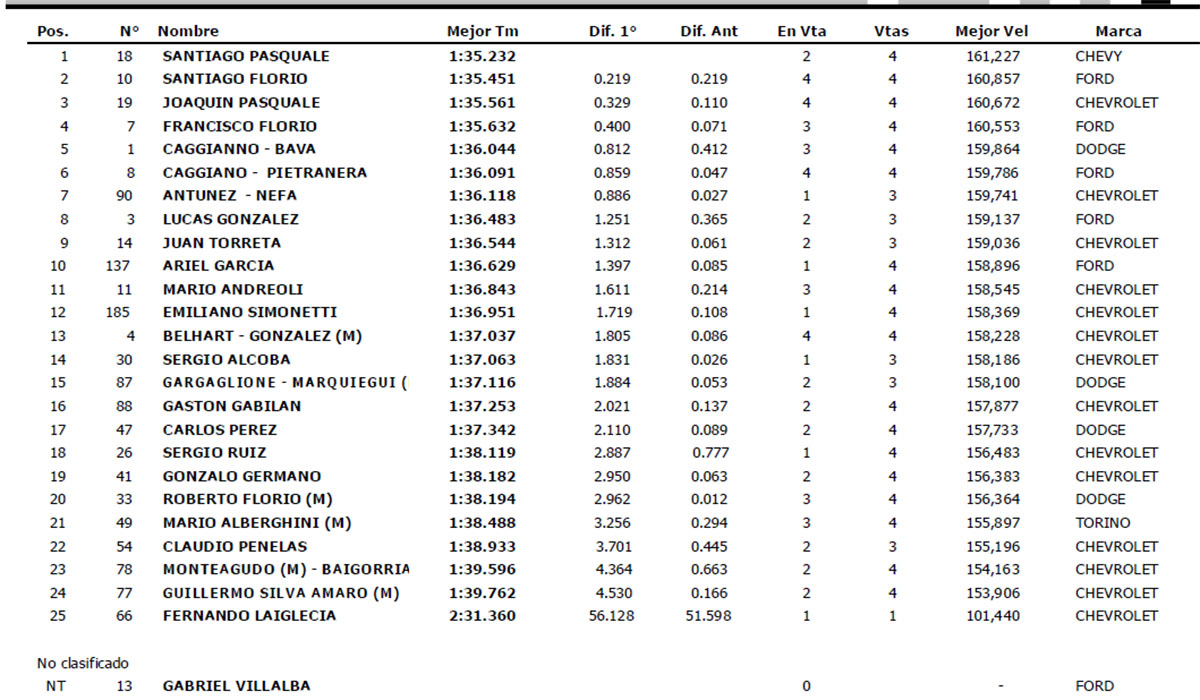 estableciendo un registro de 1min 35seg 232 /1000 el Piloto que representa a Baradero se quedó con los primeros tres puntos en juego del fin de semana, dejando segundo a Santiago Florio por 219 milésimas, tercero a su Hermano Joaquin Pascuales por 329 milésimas y cuarto a Francisco Florio por 400 milésimas, destacando que 7 autos quedaron encerrados en una diferencia de 886 milésimas sobre un total de 25 autos que lograron registro de vuelta.