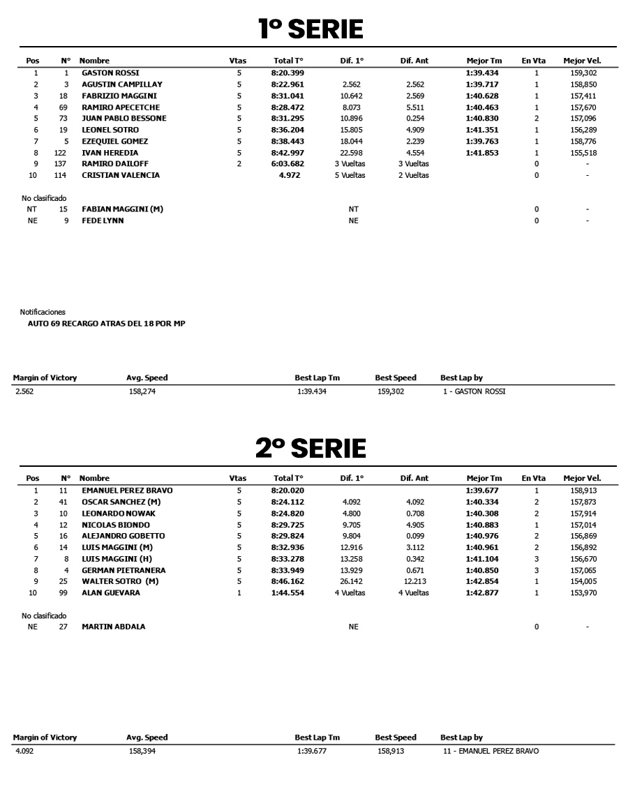 La primera serie tuvo un duelo interesante a hierro corto entre el Campeón Rossi y Agustín Campillay, ambos pilotos hicieron las cinco vueltas del parcial en una baldosa con Ezequiel Gómez como espectador de lujo hasta que sufrió un despiste mediando el parcial. En la lucha por la vanguardia Fabricio Maggini, Ramiro Apecetche y Juampi Bessone también dieron un gran espectáculo, lamentablemente Dailoff y Valencia sufrían problemas mecánicos y debían visitar los boxes. Rossi lograba el triunfo con Campillay como escolta, cerrando el podio de la serie Fabrizio Maggini. Campillay era recargado con un puesto por maniobra peligrosa a Fabrizio Maggini.