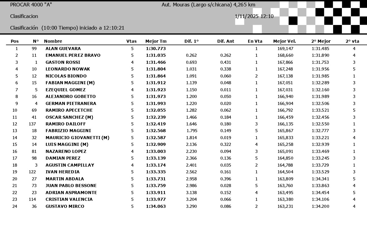 La clasificación se puso en marcha con el grupo B y ahí Ramiro Apecetche comenzaba a dominar las acciones. Luego a pista salía el grupo A de Copa de Oro y en su mejor pasada por la dirección de la deportiva, Alan Guevara establecía 1min 30seg 773/1000 para dominar las acciones comandando el Ford Falcon del equipo FH Motorsport, dejando segundo a Pérez Bravo por 262 milésimas y tercero a por 693 milésimas.