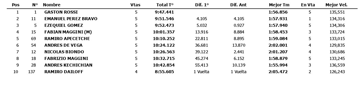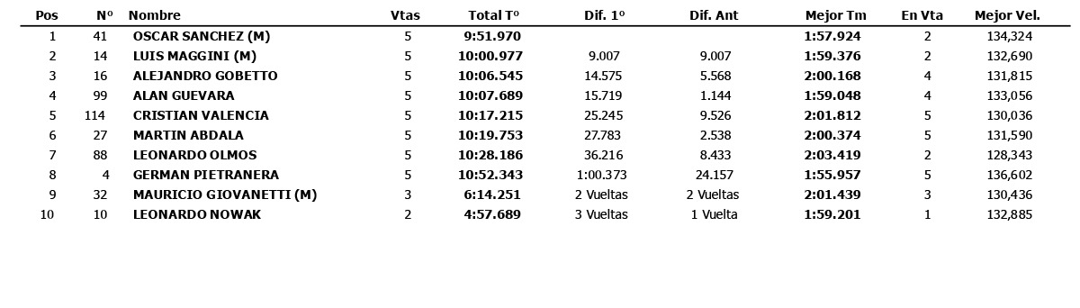 Pietranera comenzó un ataque sobre Maggini donde lo superó en el ingreso a la chicana y fue en busca de Sanchez que poseía cierto margen. Pero al Torino nro. 4 le apareció una falla que retrasó de sobremanera a PIietranera relegándolo en el clasificador. Sin contrincantes cercanos, Sanchez se llevó el parcial seguido de Luis Maggini, tercero Alejandro Gobetto, cuarto Alan Guevara que pudo remontar y quinto Cristian Valencia.