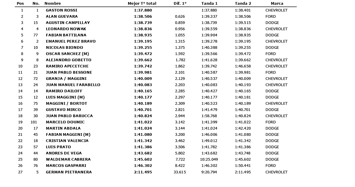 Gaston Rossi también impuso condiciones en el segundo ensayo. En esta ocasión estableciendo 1min 38seg 401 milésimas, El Campeón siguió siendo la referencia para la clase A. Segundo se acomodo Alan Guevara a 105 milésimas y tercero Leo Nowak sobre un total de 27 autos que formaron parte de la tanda.