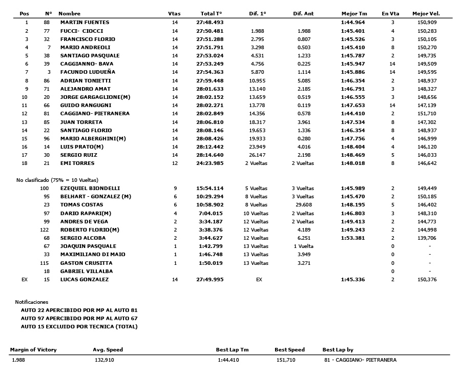 Fuentes marchaba a la victoria de manera inobjetable, logrando su segunda victoria en el año y saltando a la punta de torneo y La Copa de Oro, segundo en una gran maniobra sobre Ciocci quedaba Lucas González, pero lamentablemente la Dodge del Necochense no estaba encuadrada dentro de los parámetros reglamentarios, por lo cual era excluido, dejándole el segundo lugar a Diego Ciocci, completando el podio Francisco Florio.