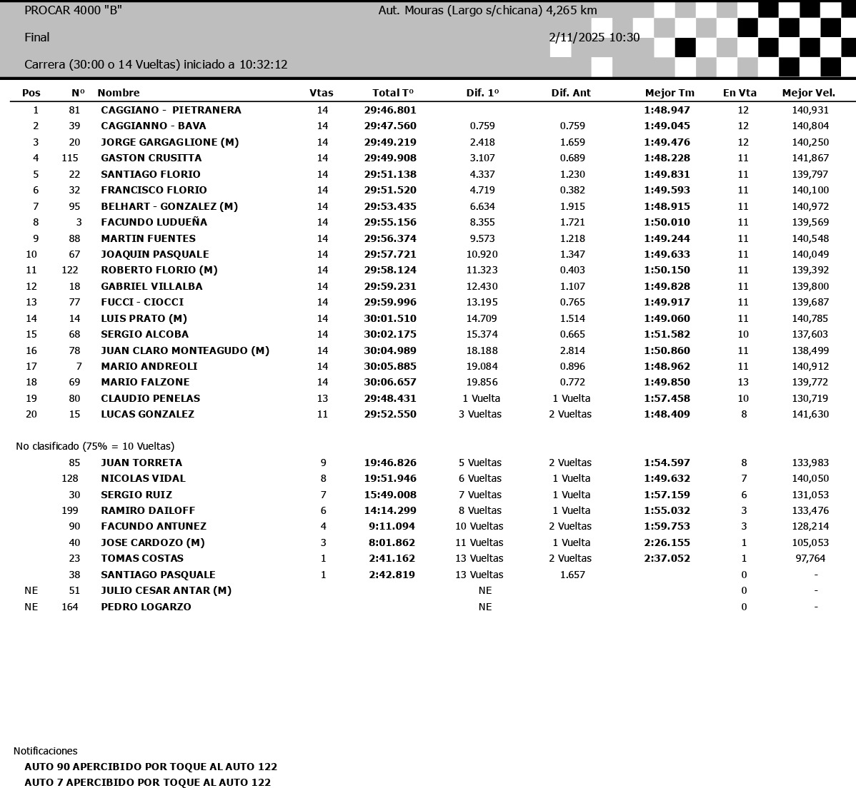 La bandera a cuadros le daba el inobjetable triunfo al binomio Caggiano - Pietranera, teniendo como escolta al binomio Caggiano. -Bava, y a Jorge Gargaglione para alegría del equipo José C. Paz que logro meter a sus tres autos en el podio.